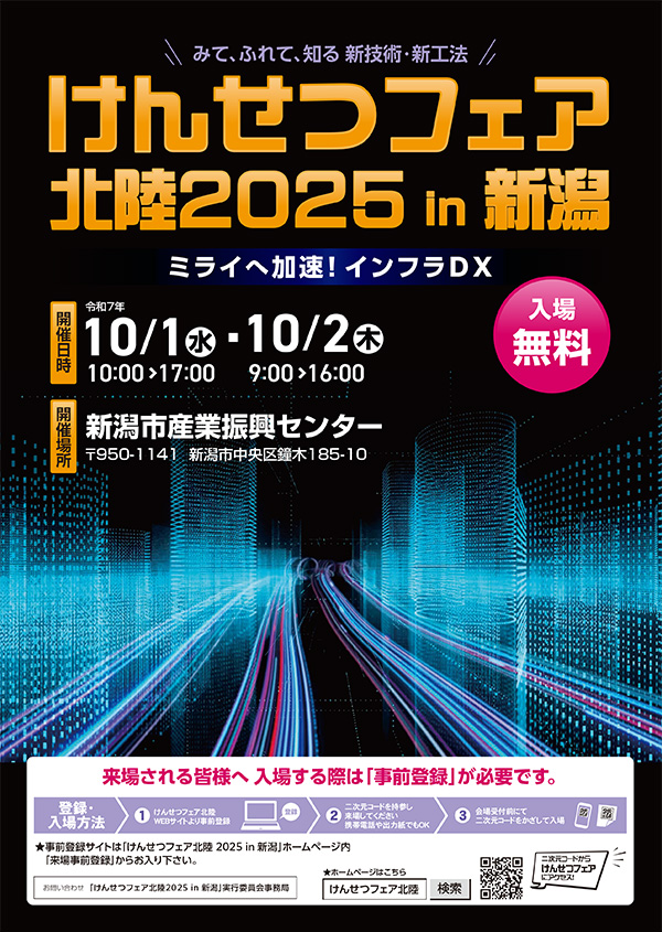2025年10月1日(水)、2日(木)の2日間、新潟県新潟市にある「新潟市産業振興センター」で、国土交通省北陸地方整備局等の主催による「けんせつフェア北陸2025 in 新潟」が開催されます。