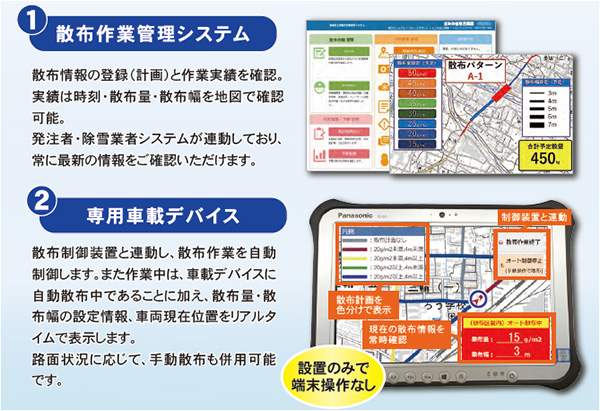 散布開始・停止、散布量・散布幅を自動制御。走行のみで散布作業が可能となり、運転助手の作業を効率化し散布作業のワンオペを実現します。