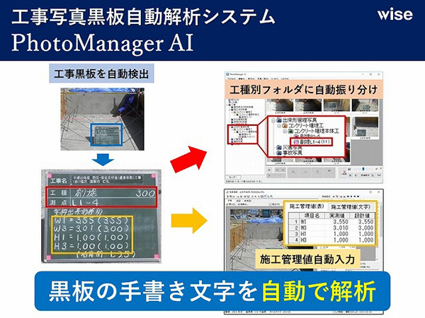 「PhotoManager AI」(https://www.wise.co.jp/quickproject/pmai/)は、工事黒板に記載された手書き文字を自動で認識し、自動振り分け・施工管理値を自動入力するシステムです。