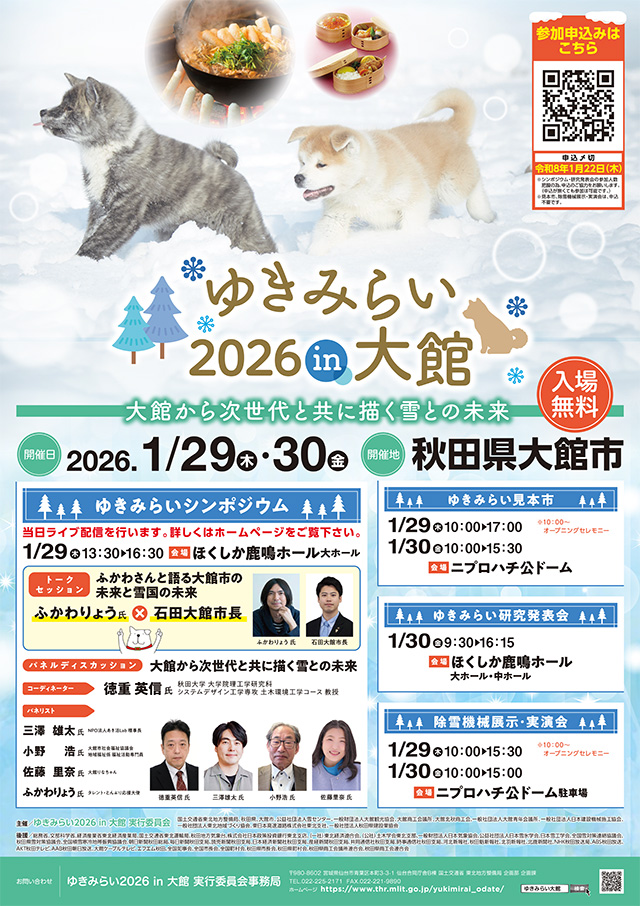 2026年1月29日(木)、30日(金)の2日間、秋田県大館市にあるニプロハチ公ドーム、ほくしか鹿鳴ホールで、国土交通省東北地方整備局等の主催による「ゆきみらい2026in大館」が開催されます。