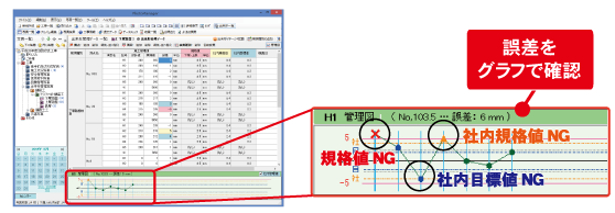 管理図(誤差のばらつき)のグラフも表示でき、規格値や社内規格値、社内目標値を超えたデータは区別して表示され、写真管理の早い段階から出来形管理の対策を行えます。